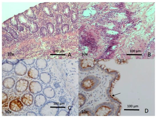 (Hematoxylin-eosin staining; original magnification, 10×) Photomicrograph of the small intestine shows widespread inflammatory infiltrate in the lamina propria and in the submucosal layer (A) as well as perivascular (B). Immunohistochemistry, anti-SARS-CoV-2 spike glycoprotein (C), and SARS nucleocapsid protein antibody (D): extensive and well-defined cytoplasmic, supranuclear (arrow) immunostaining in the mucosal epithelial cells.