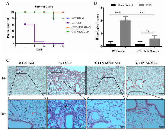 3.1. Cortactin Deficiency Improves Survival and Protects against Sepsis-Induced Lung Damage
