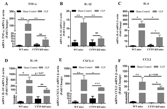 CXCL-1 and CCL2 are chemokines crucial for the recruitment of neutrophils and monocytes during inflammation; and sepsis induces chemokine receptor expression on peripheral neutrophils [24]. As expected, CLP sepsis in WT mice caused significantly increased expression of both CXCL-1 and CCL2 compared to sham control. Notably, the lungs of septic CTTN KO mice showed reduced expression of these chemokines (Figure 2E,F), which was statistically significant and may explain the reduced leukocyte recruitment observed in the histology.