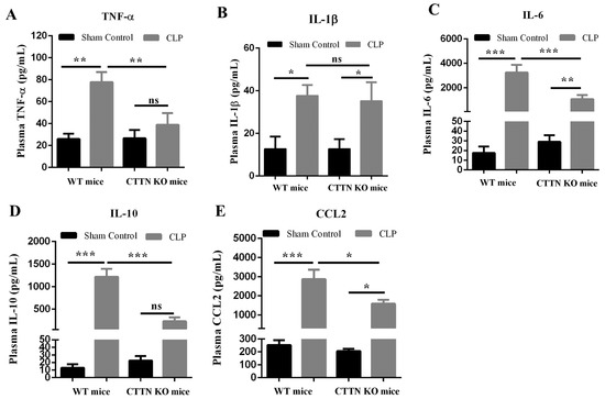 Loss of cortactin ameliorates systemic inflammation during sepsis. Plasma protein levels of the cytokines (A) TNF-α, (B) IL-1β, (C) IL-6, (D) IL-10, and (E) CCL2 were measured 24 h after CLP sepsis or sham control. Data are represented as mean ± SEM of at least 6 animals per group. * p < 0.05, ** p < 0.01, *** p < 0.001. ns: non-significant.