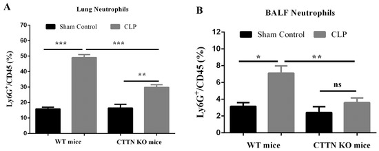 Septic lung failure is preceded by ALI [25,26], which in turn is characterised by excessive inflammation and neutrophil infiltration [26,27,28]. Given the observed reduced leukocyte presence in the lungs of septic CTTN KO mice, neutrophil numbers in lung tissues were analysed by flow cytometry. CLP sepsis caused massive neutrophil recruitment to the lungs in WT mice (49.1 ± 1.9%), which was significantly reduced in the lungs of septic CTTN KO mice (29.9 ± 1.7%) (Figure 4A). Many infiltrated neutrophils further transmigrate into the bronchoalveolar lumen, where they continue to release proteolytic enzymes and ROS and promote tissue damage [29]. Indeed, a higher frequency of neutrophils in the bronchoalveolar lavage fluid (BALF) of septic WT mice (7.1 ± 0.9%) was found that was significantly lower in the BALF of septic CTTN KO mice (3.6 ± 0.6%) (Figure 4B). These findings show that improved histology and lung injury in septic cortactin-KO mice is likely caused by reduced neutrophil infiltration.