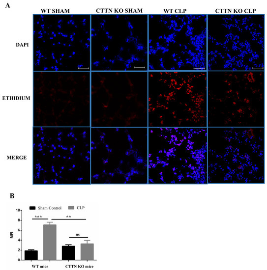 Sepsis-induced oxidative stress is reduced in the lungs of cortactin-deficient mice. (A) Representative images from freshly stained lung tissue cross-sections with dihydroethidium (DHE). Pictures were taken with a confocal laser scanning microscope; objective: 40×. Scale bars: 50 μm. (B) Quantification of the mean fluorescence intensity (MFI) of oxidised ethidium fluorescence indicating oxidative stress. Data are represented as means ± SEM of at least 4 animals per group. ** p < 0.01, *** p < 0.001, ns: not significant. DAPI, 4′,6-diamidino-2-phenylindole.