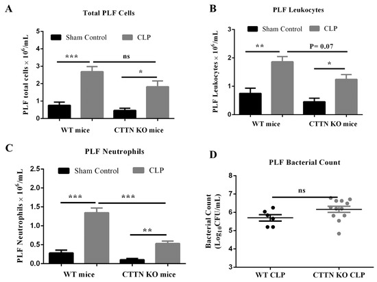 The outcome of CLP sepsis depends on how efficiently the infection in the peritoneum (primary site of infection during CLP sepsis) can be controlled [31]. Therefore, the levels of recruited neutrophils and bacterial counts in the peritoneum of sham and CLP-operated WT and CTTN KO mice were determined 24 h post-surgery. As expected, CLP induced significant cell influx into the peritoneal cavity of septic WT mice compared to their sham controls. The total number of cells and leukocytes that infiltrated the peritoneum of septic CTTN KO mice was reduced compared to septic WT mice, albeit not in a statistically significant fashion (Figure 6A,B). While CLP sepsis significantly increased neutrophil numbers in the peritoneum of WT mice ((1.4 ± 0.1) × 106 cells/mL), peritoneal neutrophil numbers in septic CTTN KO mice were significantly lower ((0.5 ± 0.1) × 106 cells/mL) compared to septic WT mice (Figure 6C). However, this difference in peritoneal neutrophil levels did not significantly affect the bacterial counts in the respective peritoneum of septic WT (5.7 ± 0.2) vs. CTTN KO mice (6.2 ± 0.2) (Figure 6D). These findings suggest that the number of recruited neutrophils in CTTN KO mice, although reduced, were sufficient to control the peritoneal infection.