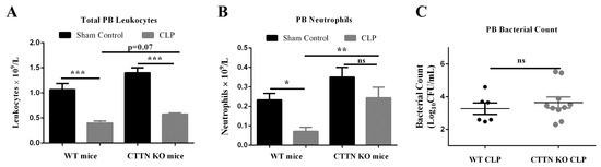 Major hallmarks of sepsis include leukopenia and neutropenia [26,32,33]. Reduced levels of circulating leukocytes predispose septic patients to opportunistic infections and increase the risk of developing severe sepsis. Given the reduced neutrophil transmigration in CTTN KO mice, we speculated that the peripheral blood of septic CTTN KO mice would have higher leukocyte numbers compared to septic WT mice that are then available to mount a more effective intravascular immune response. CLP sepsis caused decreased levels of total peripheral blood leukocytes in septic WT and CTTN KO mice (Figure 7A). A tendency towards increased total leukocytes in the blood of septic CTTN KO mice ((0.58 ± 0.03) × 109/L) compared to septic WT mice ((0.40 ± 0.04) × 109/L) was observed, albeit not in a statistically significant fashion. CLP sepsis caused neutropenia in septic WT mice 24 h after surgeries ((0.07 ± 0.02) × 109/L). Importantly, neutrophil numbers in the blood of septic CTTN KO mice were significantly higher ((0.24 ± 0.05) × 109/L) compared to septic WT mice, (Figure 7B). Thus, cortactin deficiency prevents neutropenia in septic mice.