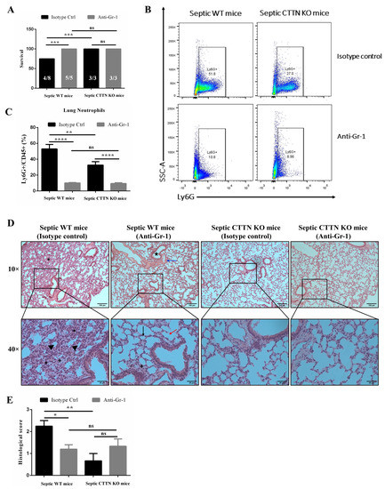 3.4. Septic CTTN KO Mice Show Reduced Lung Neutrophil Infiltration during Sepsis