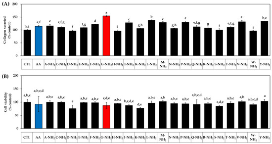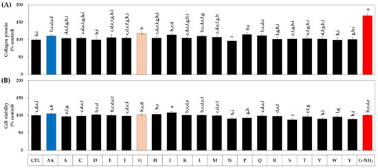Effects of twenty free amino acids on the collagen production and the viability of HDFs. AA was used as a positive control. Cells were treated with vehicle (CTL), AA, or each amino acid at 1 mM. After 48 h, the collagen protein secreted into the conditioned medium was quantitated (A). The viability of the adherent cells was determined (B). Data are presented as % of control (means ± SD, n = 3 for (A), and n = 4 for (B)). Groups that share the same alphabet letters (a–i) do not have significantly different means at the p < 0.05 level.