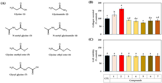 Effects of glycine analogs on collagen production and the viability of HDFs. Chemical structures of glycine (1), glycinamide (2), N-acetyl glycine (3), N-acetyl glycinamide (4), glycine methyl ester (5), glycine ethyl ester (6), and glycyl glycine (7) are shown (A). Cells were treated with vehicle (CTL) or each compound at 1 mM. After 48 h, the collagen protein secreted into the conditioned medium was quantitated (B). The viability of the adherent cells was determined (C). Data are presented as % of control (means ± SD, n = 3 for (A), and n = 4 for (B)). Groups that share the same alphabet letters (a–e) do not have significantly different means at the p < 0.05 level.