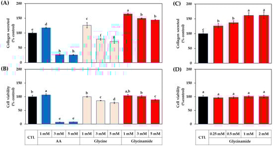 Dose-dependent effects of AA, glycine, and glycinamide on the collagen production of HDFs. Cells were treated with vehicle (CTL) or 1–5 mM of each compound (A,B) or 0.25–2 mM of glycinamide (C,D). After 48 h, the collagen protein secreted into the conditioned medium was quantitated (A,C). The viability of the adherent cells was determined (B,D). Data are presented as % of control (means ± SD, n = 3 for (A–C), and n = 4 for (D)). Groups that share the same alphabet letters (a–h) do not have significantly different means at the p < 0.05 level.