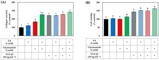 Effects of individual and combined treatments of AA, glycinamide, and transforming growth factor (TGF)-β1 on the collagen production in HDFs. Cells were treated with AA, glycinamide, or TGF-β1 each or in combinations. After 48 h, the collagen protein secreted into the conditioned medium (A) and the viability of the adherent cells (B) were determined. Data are presented as % of control (means ± SD, n = 3 for (A), and n = 5 for (B)). Groups that share the same alphabet letters (a–f) do not have significantly different means at the p < 0.05 level.