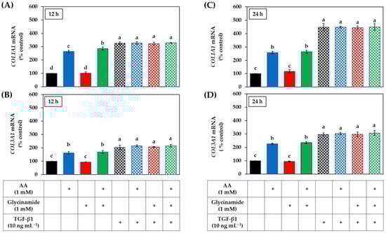 Effects of individual and combined treatments of AA, glycinamide, and TGF-β1 on the mRNA expression of procollagen genes in HDFs. Cells were treated with AA, glycinamide, or TGF-β1 each or in combinations for 12 h (A,B) or 24 h (C,D). The mRNA levels of COL1A1 (A,C) and COL3A1 (B,D) were analyzed by quantitative reverse transcriptase-polymerase chain reaction (qRT-PCR) and the results were normalized to that of glyceraldehyde 3-phosphate dehydrogenase (GAPDH). Data are presented as % of control (means ± SD, n = 3). Groups that share the same alphabet letters (a–d) do not have significantly different means at the p < 0.05 level.