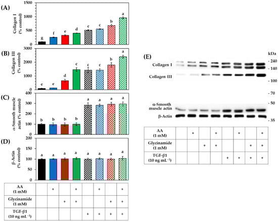 Effects of individual and combined treatments of AA, glycinamide, and TGF-β1 on the protein levels of collagen I, III, α-smooth muscle actin, and β-actin in HDFs. Cells were treated with AA, glycinamide, or TGF-β1 each or in combinations for 24 h. The intracellular protein levels of collagen I (A), collagen III (B), α-smooth muscle actin (C), and β-actin (D) were analyzed by Western blot. A reconstituted image of typical blots is shown with molecular weight markers (E). Data are presented as % of control (means ± SD, n = 3). Groups that share the same alphabet letters (a–g) do not have significantly different means at the p < 0.05 level.