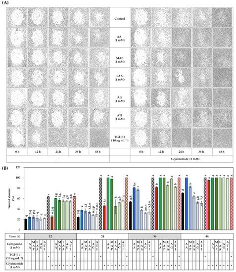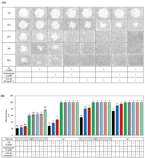 Effects of individual and combined treatments of AA, glycinamide, and TGF-β1 on the wound closure in HDFs. Cells were cultured for 12 h in the presence of a stopper to create a small circular wound. After removing the stopper, cells were treated with AA, glycinamide, or TGF-β1 each or in combinations for 48 h. Representative microscopic wound images before and after treatments are shown in panel (A). Quantitated data for wound closure (%) at different time points are shown in panel (B) (means ± SD, n = 3). Groups that share the same alphabet letters (a–m) do not have significantly different means at the p < 0.05 level.