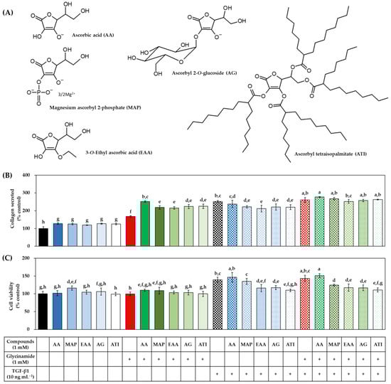 Effects of individual and combined treatments of AA analogs, glycinamide, and TGF-β1 on the collagen production in HDFs. Chemical structures of AA analogs, such as AA, magnesium ascorbyl 3-phosphate (MAP), 3-O-ethyl ascorbic acid (EAA), ascorbyl 2-O-glucoside (AG), and ascorbyl tetraisopalmitate (ATI), are shown (A). Cells were treated with an AA analog alone or in combination with glycinamide and/or TGF-β1. After 48 h, the collagen protein secreted into the conditioned medium (B) and the viability of the adherent cells (C) were measured. Data are presented as % of control (means ± SD, n = 3 for (A), and n = 5 for (B)). Groups that share the same alphabet letters (a–h) do not have significantly different means at the p < 0.05 level.