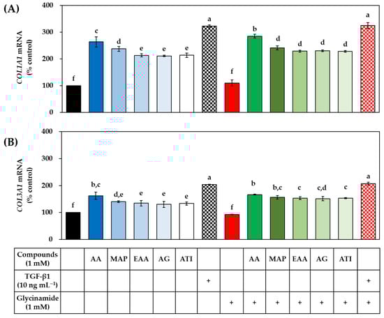 Effects of individual and combined treatments of AA analogs (such as AA, MAP, EAA, AG, and ATI), glycinamide, and TGF-β1 on the mRNA expression of procollagen genes in HDFs. Cells were treated with an AA analog or TGF-β1 in the absence or presence of glycinamide for 12 h. The mRNA levels of COL1A1 (A) and COL3A1 (B) were analyzed by qRT-PCR and the results were normalized to that of GAPDH. Data are presented as % of control (means ± SD, n = 3). Groups that share the same alphabet letters (a–f) do not have significantly different means at the p < 0.05 level.