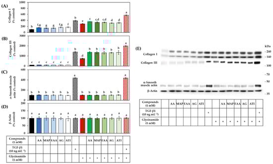 Effects of individual and combined treatments of AA analogs (such as AA, MAP, EAA, AG, and ATI), glycinamide, and TGF-β1 on the protein levels of collagen I, III, α-smooth muscle actin, and β-actin in HDFs. Cells were treated with an AA analog or TGF-β1 in the absence or presence of glycinamide for 24 h. The intracellular levels of collagen I (A), collagen III (B), α-smooth muscle actin (C), and β-actin (D) were analyzed by Western blot. A reconstituted image of typical blots is shown with molecular weight markers (E). Data are presented as % of control (means ± SD, n = 3). Groups that share the same alphabet letters (a–h) do not have significantly different means at the p < 0.05 level.