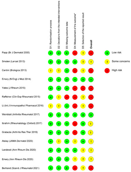 Etanercept, which is usually administered subcutaneously once or twice a week, was evaluated in 14 studies [29,30,31,32,33,34,35,37,38,39,42,43,44,45]. Adalimumab, normally administered subcutaneously every other week, was evaluated in eight studies [37,38,39,41,44,46,47,48]. Certolizumab, which is usually administered subcutaneously every other week until remission and then every four weeks, was evaluated in two studies [36,40]. The intravenous administration of infliximab, which is usually carried out with three induction doses over 6 weeks (weeks 0–2–6), followed by maintenance therapy every 8 weeks, was evaluated in two studies [38,44]. Golimumab, commonly administered subcutaneously every four weeks, was evaluated in one study [38]. In Table S3, the standard regimen and the dose de-escalation strategy for each study are described in detail.