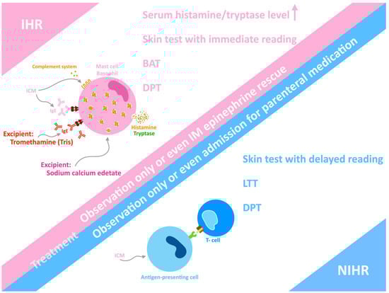 Summary of iodinated contrast media (ICM)-induced hypersensitivity. ICM or excipients may activate the basophil or mast cell to release histamine and other mediators, and then induce immediate hypersensitivity reaction (IHR) via IgE-mediated or non-IgE pathways, such as the complement system pathway. Non-immediate hypersensitivity reaction (NIHR) induced by ICM can be evoked by a T-cell mediated pathway. Skin test, basophil activation test (BAT), drug provocation test (DPT), and lymphocyte transformation test (LTT) can achieve the diagnosis of ICM hypersensitivity. In patients with anaphylaxis or severe, prolonged symptoms of NIHR, prompt and appropriate intervention is needed.