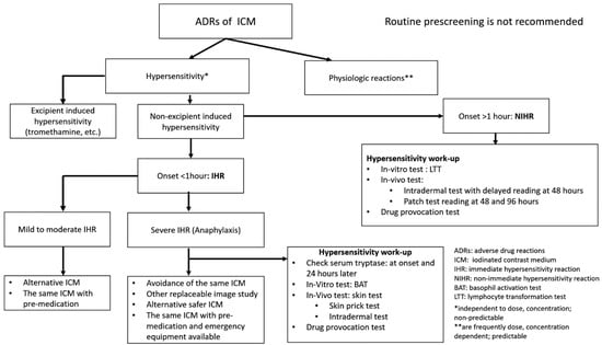 The latency of T cell-mediated delayed-type hypersensitivity to ICM ranges from hours to days after administration of the ICM. Usually, drug reactions with eosinophilia and systemic symptoms develop after exposure to the culprit drug for 2 to 4 weeks, but if induced by ICM, the latency is shorter (usually within the week following ICM administration) [39]. A positive lymphocyte transformation test (LTT) and ICM-specific T cell clones have been demonstrated in some patients [42]. The classification and recommendations for ADRs of ICM are shown in Figure 2.