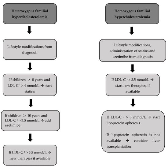 Familial Hypercholesterolemia (FH) is a genetic condition with high prevalence in the general population around the world; it is characterized by elevated plasma concentrations of cholesterol, in particular high Low-Density Lipoprotein Cholesterol (LDL-C) levels, from birth or even before, possible to detect in utero. People affected by FH show a greater risk of early and progressive atherosclerotic cardiovascular disease (ASCVD), which can also be recognized in children and adolescents, and typical physical signs, such as tendon xanthomas []. The hereditary pattern of FH is autosomal dominant; it can be distinguished as a homozygous FH (HoFH), which is caused by a double deleterious mutation in the FH gene and is very rare and severe, and a heterozygous FH (HeFH), which is caused by the mutation of just one allele and is more common, but less severe. In particular, HoFH occurs in one per million individuals worldwide, while two recent meta-analyses have shown that the prevalence of HeFH corresponds to one in around every 311–313 people, with a rough estimate of 6.8–8.5 million children and adolescents affected globally [,]. It has been documented that, universally, one baby with HeFH is born per minute []. Given the relevance of this disorder, which is considered a current major public health, screening programs and precocious detection of FH have the priority, as reported in 1999 by World Health Organization (WHO) recommendations, and recently confirmed and extended by Wilemon et al. []. Nevertheless, diagnosis of FH in the pediatric age is still controversial, since both physical signs and family history might often be difficult to be revealed in youth. Regarding FH treatment in children and adolescents, there is no collective thinking on the best timing, management, and/or types of patients that need it []. Therefore, the purpose of this review is to focus on the importance of early FH detection, and to highlight the best therapeutic strategies for both HeFH and HoFH, including the recent approaches based on current clinical evidence, that need to be adopted from the earliest stages of life.