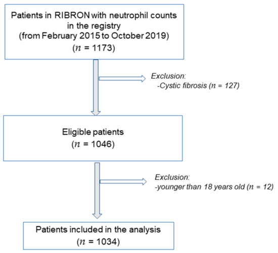 Wang X, Olveira C, Girón R, García-Clemente M, Máiz L, Sibila O, Golpe R, Menéndez R, Rodríguez-López J, Prados C, et al. Blood Neutrophil Counts Define Specific Clusters of Bronchiectasis Patients: A Hint to Differential Clinical Phenotypes. Biomedicines. 2022; 10(5):1044. https://doi.org/10.3390/biomedicines10051044