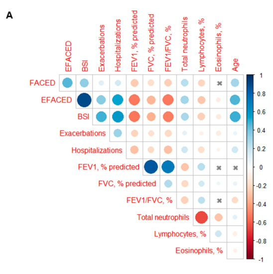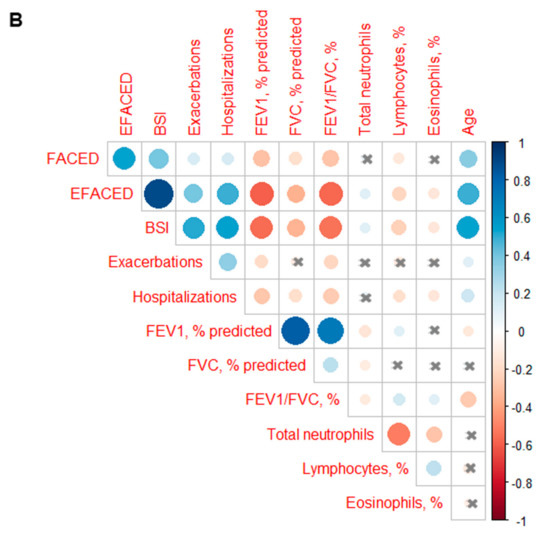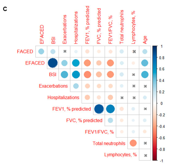 - Wang, X.; Villa, C.; Dobarganes, Y.; Olveira, C.; Girón, R.; García-Clemente, M.; Máiz, L.; Sibila, O.; Golpe, R.; Menéndez, R.; et al. Systemic Inflammatory Biomarkers Define Specific Clusters in Patients with Bronchiectasis: A Large-Cohort Study. Biomedicines 2022, 10, 225. [Google Scholar] [CrossRef] [PubMed]