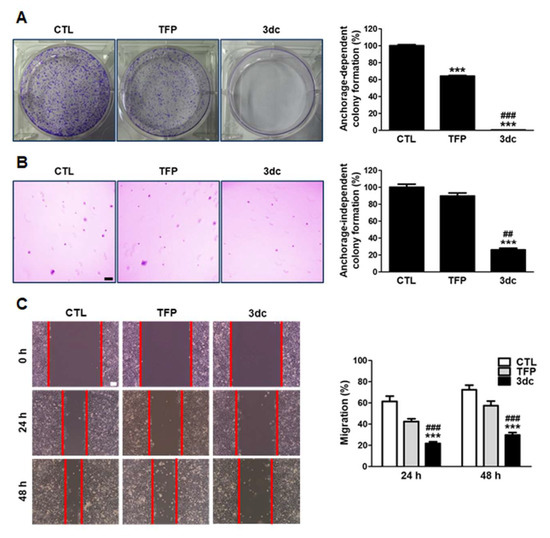 Treatment with TFP and 3dc suppressed anchorage-dependent and anchorage-independent A549 cell growth. Cells were seeded and treated with 5 μM of TFP and 3dc. (A) After 8 days of incubation, colonies were photographed with a digital camera and manually counted. (B) After 18 days of incubation, colonies were photographed at a magnification of 40X (scale bar represents 200 μm). (C) TFP and 3dc decreased A549 cell migration. Cell growth surface was scratched and treated with 5 μM of TFP and 3dc. After 24 h and 48 h of incubation, migrating cells were photographed at a magnification of 100× (scale bar represents 100 μm). Lines indicate wound boundaries after scratch. The data are shown as the mean ± SE. *** p < 0.001 vs. CTL, ## p < 0.01, ### p < 0.001 vs. TFP.