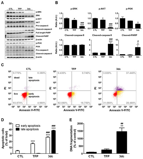 Western blot analysis of apoptosis- and survival-related factors. (A) A549 cells were treated with 10 μM TFP and 3dc for 48 h. Whole cell lysates were analyzed by western blot with antibodies specific to p-ERK, ERK, p-AKT, AKT, p-PI3K, PI3K, caspase 8, caspase 9, and PARP. β-actin was used as a protein loading control. (B) Protein expression levels were assessed using ImageJ software and represented as the change of each group relative to the CTL group using arbitrary units. (C) Flow cytometric analysis of TFP- and 3dc-treated cells. A549 cells were treated with 10 μM TFP and 3dc for 48 h and then stained with Annexin V-FITC and PI. CTL (left), TFP (center), 3dc (right). (D) Percentage of apoptotic cells. (E) Quantification of DNA fragmentation after 48 h incubation of A549 cells with 10 μM TFP and 3dc. The data are shown as the mean ± SE. * p < 0.05, ** p < 0.01, *** p < 0.001 vs. CTL, # p < 0.05, ## p < 0.01, ### p < 0.001 vs. TFP.