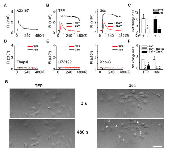 In cells pretreated with thapsigargin (Thapsi), which stimulates Ca2+ release from intracellular Ca2+ stores, neither TFP nor 3dc increased intracellular Ca2+ levels (n = 20, Figure 4D). To determine the possible involvement of the phospholipase C (PLC)-ITP signaling pathway, we applied a specific PLC inhibitor (U73122, 5 μM) and an ITPR antagonist (xestospongin-C (Xes-C), 10 μM). In cells preincubated with U73122 or Xes-C for 10 min, TFP and 3dc did not increase intracellular Ca2+ levels (n = 90, Figure 4E). We found that U73122 and Xes-C treatment significantly reduced 3dc- and TFP-induced Ca2+ increases (p < 0.05, Figure 4F). However, in some cells, Xes-C treatment did not completely block the effects of TFP. In addition, 3dc treatment slightly decreased basal Ca2+ levels in cells pretreated with U73122 and Xes-C. Moreover, 3dc treatment induced bleb formation (Figure 4G).