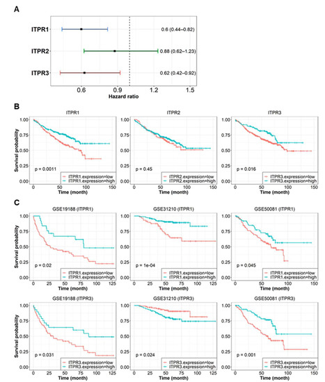 We first assessed associations between the expression values of all ITPRs (ITPR1, ITPR2, ITPR3) and overall survival in lung cancer patients. For the survival analysis, we divided patients into high- and low-expression groups using the gene expression values of interest with the best thresholds (see Materials and Methods). Patients with increased ITPR1 expression showed a significantly higher survival rate than those with increased expression of other ITPRs (Figure 5A,B, log-rank p-value = 0.0011, HR = 0.60, 95% CI 0.44–0.82). The ITPR3 expression level was also significantly associated with the overall survival rate (Figure 5A,B, P = 0.016, HR = 0.63, 95% CI 0.42–0.92). To confirm that a significant change in survival rate did not appear by chance, we performed a similar analysis for single datasets before integration. We obtained an equivalent tendency of association between ITPR expression and survival outcome in these studies as well (Figure 5C).