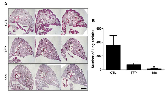 Inhibitory effect of TFP and 3dc on metastasis in A549 cell-derived xenograft model. A549 cells were intravenously injected into mice through the tail vein. After 3 days, the mice were divided into three groups (CTL, TFP, and 3dc; n = 10 in each group). The mice were then injected intraperitoneally with CTL (vehicle), TFP, and 3dc (5 mg/kg/day, 5 days/week, for 4 weeks). (A) Lungs from the mice in the orthotopic xenograft model were harvested, sliced, and H&E stained. Scale bar represents 1 mm. (B) The graph shows the number of lung nodules. The values are mean ± SE. * p < 0.05 vs. CTL.