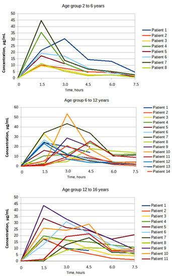 The lowest values of the mean AUC0-t, µg·h/mL and AUC0-t_norm, (µg·h/mL)/(mg/kg) (69.84 ± 35.29 and 3.33 ± 1.98, respectively) were defined in the group of children aged 2–6 years. The highest values of the mean AUC0-t, µg·h/mL and AUC0-t_norm, (µg·h/mL)/(mg/kg) (100.53 ± 46.6 and 4.77 ± 2.20, respectively) were obtained in the group of 12–18 years. A similar upward trend in the mean values seen with increased age was also observed for the values of Cmax (µg/mL) and Cmax_norm (µg/mL)/(mg/kg). In the younger age group, the mean values were 22.32 ± 13.15 µg/mL and 1.03 ± 0.55 (µg/mL)/(mg/kg), respectively, in the older age group the mean values were 23.63 ± 9.51 µg/mL and 1.12 ± 0.47 (µg/mL)/(mg/kg), respectively. The obtained pharmacokinetic parameters are shown in Table 2.