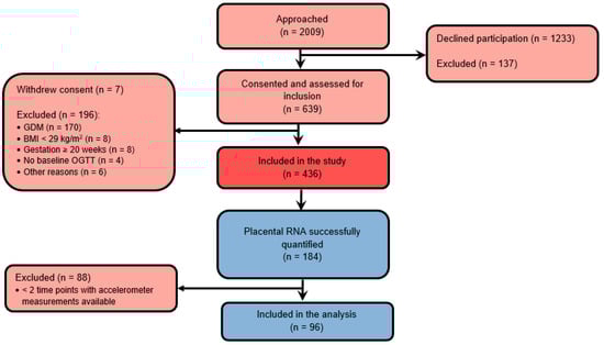 - Acosta-Manzano, P.; Leopold-Posch, B.; Simmons, D.; Devlieger, R.; Galjaard, S.; Corcoy, R.; Adelantado, J.M.; Dunne, F.; Harreiter, J.; Kautzky-Willer, A.; et al. The unexplored role of sedentary time and physical activity in glucose and lipid metabolism-related placental m, RNAs in pregnant women who are obese: The DALI lifestyle randomised controlled trial. BJOG Int. J. Obstet. Gynaecol. 2021, 129, 708–721. [Google Scholar] [CrossRef]