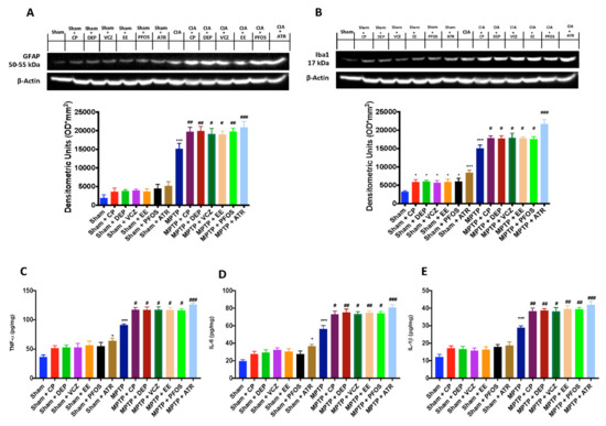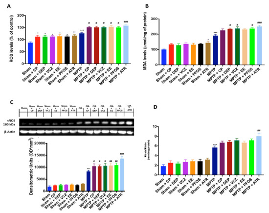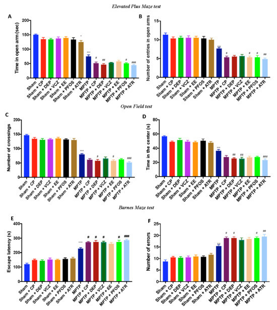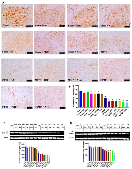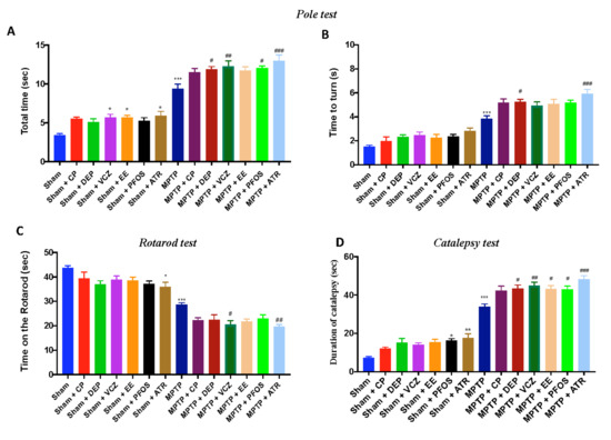 - Sham groups = only saline solution was administered i.p. during the 1st day, such as how the MPTP protocol and vehicle or CP, or DEP or VLZ, or EE or PFOS or ATR were administered for 7 days.