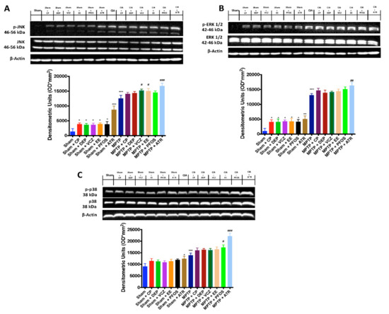 2.6. Western Blot Analysis of TH, DAT, α-syn, GFAP, Iba-1, Nrf-2, Heme Oxigenase-1 (HO-1) and Neuronal Nitric Oxide Synthase (nNOS), p-JNK, p-ERK 1/2 and p-p38