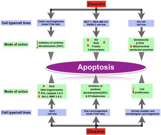 - Perumal, S. Effect of diosmin on apoptotic signaling molecules in N- nitrosodiethylamine-induced hepatocellular carcinoma in experimental rats. Mol. Cell. Biochem. 2018, 449, 27–37. [Google Scholar] [CrossRef] [PubMed]