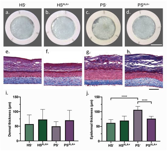 Biological activity of α-linolenic acid on skin substitute morphology. (a–d) Macroscopic appearance and (e–h) histological appearance after Masson’s trichrome staining of the skin substitutes. Scale bar: (a–d) 1 cm; (e–h) 100 µm. Thickness measurements of the dermis (i) and the epidermis (j) (N = 3 donors, n = 2 skin substitutes per donor). (i,j) Statistical significance was determined using one-way ANOVA followed by Tukey’s post-hoc test. **** p < 0.0001. Abbreviations: ALA—α-linolenic acid; HS—healthy substitute; PS—psoriatic substitute.