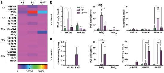 Levels of lipid mediators in the dermis. (a) Heatmap of bioactive lipid mediators found in the dermis of the skin substitutes as determined by targeted LC-MS/MS (N = 3). (b) n-6-derived and (c) n-3-derived bioactive lipid mediators from (a) that were the most differentially measured between HS−, PS−, and PSALA+ dermis. Statistical significance was determined in (b,c) using two-way ANOVA followed by Tukey’s post-hoc test, with the exception of 13-HOTrE, for which statistical significance was determined using one-way ANOVA followed by Tukey’s post-hoc test. * p < 0.05; ** p < 0.01; *** p < 0.001; **** p < 0.0001. Abbreviations: AEA—N-arachidonoyl-ethanolamine; ALA—α-linolenic acid; DHEA—N-docosahexaenoyl-ethanolamine; EPEA—N-eicosapentaenoyl-ethanolamine; HEPE—hydroxyeicosapentaenoic acid; HETE—hydroxyeicosatetraenoic acid; HFA—hydroxy-fatty acid; HODE—hydroxyoctadecadienoic acid; HOTrE—hydroxyoctadecatrienoic acid; HS—healthy substitute; MaR—maresin; PG—prostaglandin; PS—psoriatic substitute; Rv—resolvin.