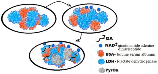 Schematic representation of LDH-NAD+/PyrOx biosensor GA-BSA, LDH.