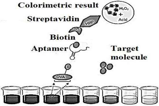 Schematic representation of an indirect competitive enzyme-linked aptamer assay (ELAA)-based aptasensor.