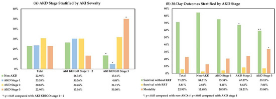 Relationship between AKI severity, AKD stage, and 30-day outcome after AKI. (A). AKD stage stratified by AKI severity; (B). 30-day outcomes stratified by AKD stage. All comparisons were performed using the chi-square test. AKD, acute kidney disease; AKI, acute kidney injury; KDIGO, Kidney Disease Improving Global Outcomes criteria; RRT, renal replacement therapy.