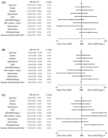 Forest plots of independent predictors of AKD severity in patients with AKI. (A). AKD Stage 1 vs. non-AKD; (B). AKD Stage 2 vs. non-AKD; (C). AKD Stage 3 vs. non-AKD. Age, sex, diabetes, hypertension, and covariates with a p-value of <0.10 in univariate analyses were adjusted for multinomial logistic regression analysis with the enter method. CI, confidence interval; CKD, chronic kidney disease; eGFR, estimated glomerular filtration rate; OR, odds ratio. *: p < 0.05.