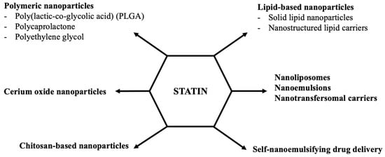 According to different human studies, long-term statin treatment often causes several adverse effects described shortly in the Part 2 [,]. In clinical practice, in such cases, statin doses are reduced, combined with ezetimibe or PCSK9 inhibitors, and/or vitamins or coenzyme Q10 are added to the treatment regimen respectively. In addition, there are several statin-intolerant patients who are unable to tolerate statins at any dose. Considering its low water solubility, rapid metabolism, low bioavailability, and several clinical complications of statins, it is desirable to improve the therapeutic efficacy of the drug and reduce its side effects by developing different therapeutic approaches, such as nanomedicine options [,,]. Today, several nano-formulations, including polymeric nanoparticles, lipid-based nanoparticles, chitosan-based nanoparticles, nanoliposomes, nanoemulsions, nanotransfersomal carriers, self-nanoemulsifying systems, and cerium oxide nanoparticles have been formulated to increase the bioavailability and therapeutic efficacy of statins (Figure 2).