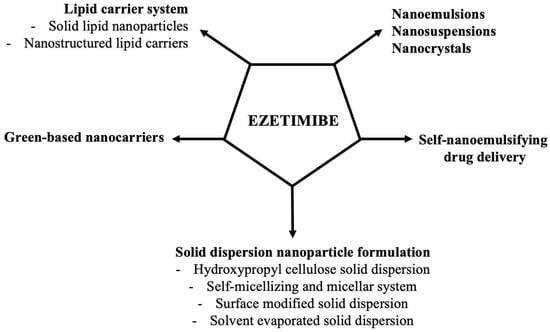 According to the Biopharmaceutics Classification System, ezetimibe belongs to the class II/IV of compounds which display a low aqueous solubility and absorption and high permeability resulting in poor bioavailability []. In the literature, many approaches can be found concerning upgrade ezetimibe drug profile (Figure 3).