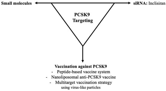 With the exception of monoclonal antibodies, the inhibition of PCSK9 is targeting via siRNA against PCSK9 synthesis and expression, small molecules, and vaccination against PCSK9 (Figure 4). While siRNA is in the phase III clinical stage, the last two brand-new approaches are still in the preclinical study stage [,,].
