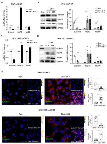 Dyskerin silencing stimulates the expression of chaperones involved in protein refolding. (A,B) qRT-PCR analysis showing the accumulation of Hsp70 and Hsp90 mRNAs in RKO-shDKC1 (A) and HEK 293T-shDKC1 cells (B) after DKC1 silencing induced by 96 h of Dox treatment. Data shown are relative to the untreated (Dox–) condition and as mean ± SEM (n = 3). (C,D) Western blot analysis showing an increased accumulation of Hsp70 and Hsp90 in RKO-shDKC1 (C) and HEK 293T-shDKC1 cells (D) after dyskerin depletion induced by 48 or 96 h of Dox treatment. The intensity of the bands was normalized to GAPDH and the differential accumulations evaluated with respect to the Dox– condition. Data are presented as mean ± SEM (n = 3). (E,F) Confocal images showing the increase in calreticulin (CRT) in RKO-shDKC1 (E) and HEK 293T-shDKC1 cells (F) treated with Dox for 96 h (Dox+) compared to their untreated control cells (Dox–). Scale bars 10 μm. Nuclei were counterstained with DAPI. CRT immunoreactivity is in red or Fire-Lut (false color Fire-Lookup Table) in separate channels. Dyskerin immunoreactivity is in green or in Thal-Lut (false color Thal-Lookup Table). CRT and dyskerin accumulation levels were quantified in multiple cells (n = 16 RKO-shDKC1 Dox–; n = 18 RKO-shDKC1 Dox+ 96 h; n = 16 HEK 293T-shDKC1 Dox–; n = 14 293T HEK 293T-shDKC1 Dox+ 96 h), normalized and reported relative to the Dox– condition as mean ± SEM. An unpaired one-tailed t-test was used in pairwise comparisons with respect to the Dox– condition in all statistical analyses in this figure (**** p < 0.0001; *** p < 0.001; ** p < 0.01; * p < 0.05; ns, p > 0.05).
