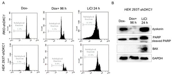 Severe and prolonged ERS conditions that prevent cells from restoring ER homeostasis can lead the UPR to activate the apoptotic program, leading to cell death [,]. ERS-induced apoptosis can occur via different pathways []. In order to evaluate if dyskerin depletion could trigger apoptosis, we examined the silenced cells directly by flow cytometry analysis. To set up the optimal conditions and discriminate apoptotic cells from live cells, we used RKO and HEK 293T untreated cells as internal controls in these experiments. When these cells were induced to undergo apoptosis by a 24 h treatment with 60 mM LiCl, a GSK3β inhibitor known to induce apoptosis in several human cell lines [,,], they exhibited a high percentage of subdiploid cells (Figure 3A). In contrast, when Dox-treated RKO and HEK 293T cells were analyzed for their DNA content, they presented only a negligible percentage of the subdiploid peak (Figure 3A), indicating that they are not subjected to apoptosis. Next, we checked by Western blotting the cleavage of poly (ADP-ribose) polymerase-1 (PARP-1), a known apoptotic marker, and found it was not activated by dyskerin depletion in HEK 293T cells. In contrast, its induction was efficiently triggered by LiCl treatment (Figure 3B). Accordingly, no induction of the apoptotic marker Bax was observed upon dyskerin silencing, while it was sharply induced upon LiCl treatment (Figure 3B). Similar results were previously obtained by our group in dyskerin-depleted RKO cells [].