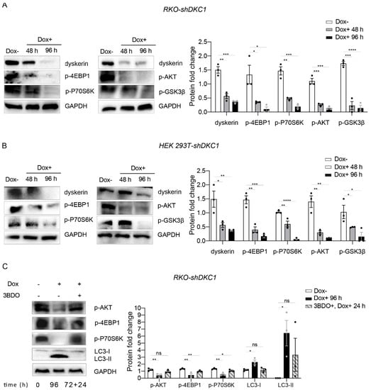Dyskerin downregulation inhibits AKT/mTOR signaling. (A,B) Western blots showing the downregulation of p-4EBP1, p-P70S6K, p-AKT and p-GSK3β upon dyskerin depletion. Band intensities for each protein were normalized to the band intensity of GAPDH and the results are expressed as mean ± SEM (n = 3). (C) The 3BDO treatment rescued the expression levels of p-AKT, p-4EBP1 and p-P70S6K and prevented the accumulation of LC3 II. In the timeline, 72 + 24 h indicates that 72 h of Dox treatment were followed by 24 h of Dox + 3BDO treatment. For quantification, the band intensity for each protein was normalized to the band intensity of GAPDH. Results are expressed as mean ± SEM (n = 3). An unpaired one-tailed t-test was used in pairwise comparisons with respect to the Dox– condition (**** p < 0.0001; *** p < 0.001; ** p < 0.01; * p < 0.05; ns, p > 0.05).