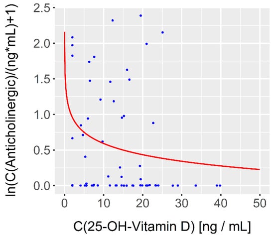- In the third analysis, we assessed the relationship between vitamin D levels (independent variable) and anticholinergic drug exposure (dependent variable) in a single bivariate regression model. To control for potential confounders, we conducted two additional sub-analyses. In the first one, we added the number of cigarettes per day as a second independent variable to the regression model. In the second one, we removed the two patients receiving a co-treatment with the CYP1A2-inhibitor fluvoxamine.