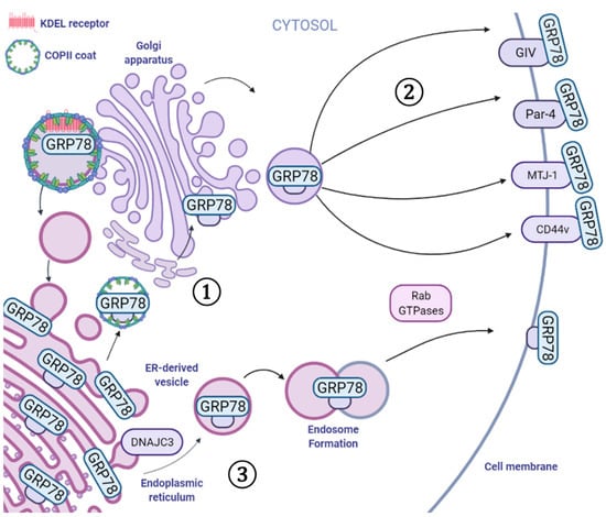 An alternative hypothesis is that ER stress may activate cell-type-specific mechanisms that facilitate GRP78 translocation to the cell surface, such as interactions with the membrane and secreted proteins. Previous reports have indicated that mutations in the substrate-binding domain of GRP78 markedly reduced csGRP78 localization in contrast to mutations in the ATPase domain [27]. Similarly, Limso et al. reported that GRP78 binds to the C-terminus of Gα-interacting vesicle-associated protein (GIV) under conditions of ER stress [31]. Although the exact mechanism by which GIV contributes to csGRP78 localization remains unclear, the knockdown of GIV was shown to attenuate ER stress-induced csGRP78 expression in HeLa cells [31]. In tamoxifen-resistant MCF7 cells, an isoform of CD44 (CD44v) has recently been reported to bind the C-terminal proline-rich repeat of GRP78 and facilitate the transport of GRP78 to the cell surface (Figure 2) [32,33]. Burikhanov et al. demonstrated that under conditions of ER stress, Par-4 and GRP78 form a complex in the ER, where Par-4 assists in the transport of GRP78 to the cell surface in response to tumor-necrosis-factor-related apoptosis-inducing ligand (TRAIL) treatment [34]. Co-chaperones such as murine Dna-J-like transmembrane protein (MTJ-1) also contribute to the localization of GRP78 to the cell surface [35]. Within the ER, MTJ-1 forms a complex with GRP78, regulating the chaperone activity of GRP78 [36]. Furthermore, the knockdown of MTJ-1 attenuates the expression of csGRP78 in murine macrophages, indicating that MTJ-1 has a role in aiding GRP78 translocation to the cell surface [35]. Consistent with these findings, knockdown of the human homologue HTJ-1 has been shown to attenuate the expression of csGRP78 in human pulmonary artery endothelial cells [37].