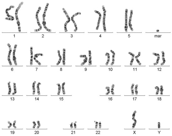 Karyogram after GTG-banding chromosome analysis revealed the presence of a marker chromosome (mar) in ~55% of the analyzed cells.
